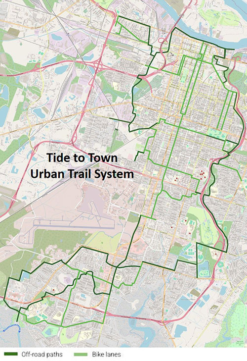 Now under construction, the Tide to Town Trail will consist of a nearly 30-mile multiuse path route around the City with separated bike lanes connecting 62 neighborhoods. The first 7-mile path segment will open in 2026.